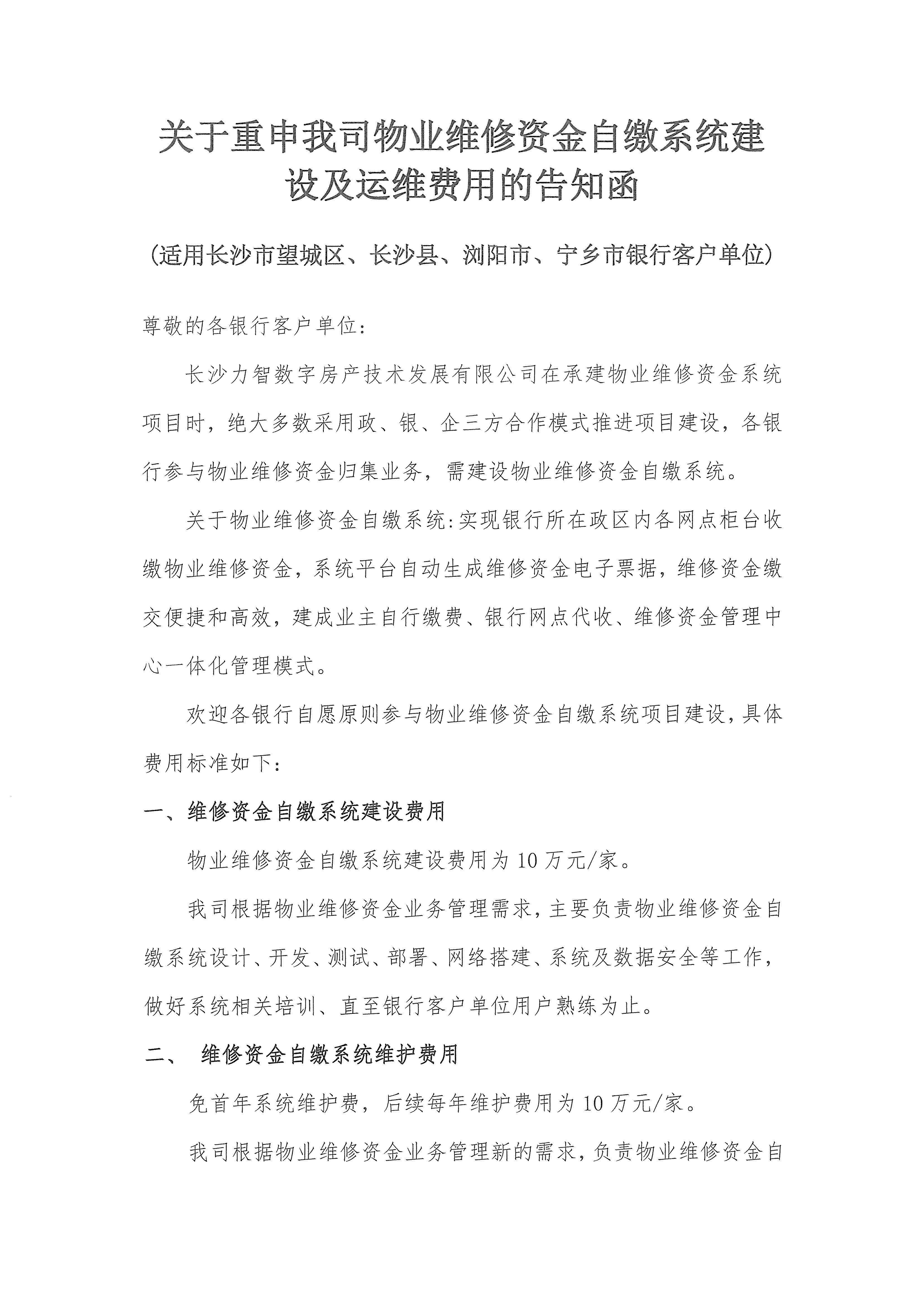关于重申我司物业维修资金自缴系统建设及运维费用的告知函(长望浏宁地区)